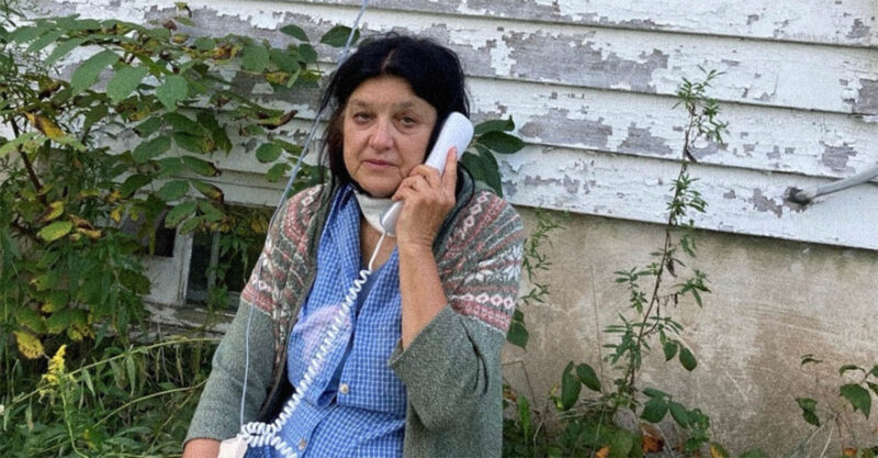 Liza using a wired landline to talk to her doctor. Fortunately, if the weather is mild, she can sit outside and use a corded landline strung through the house window.