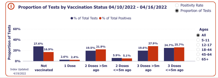 What does this robust database tell us? One might imagine it is the job of the CDC to be informing all those inquiring minds out there. However, the most consistent result one finds is unvaccinated people have the lowest positive test results across the board.